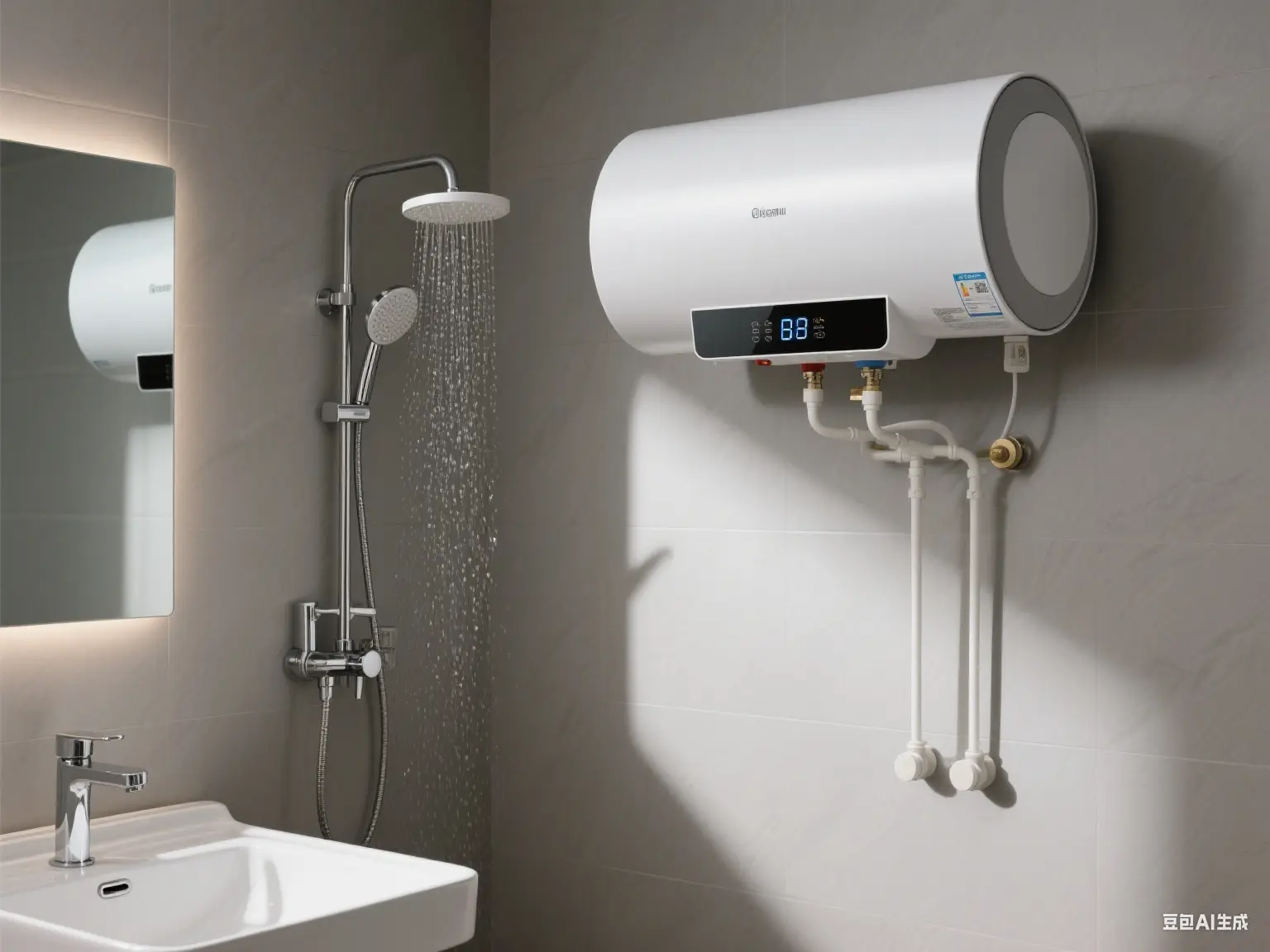 此款儲水式電熱水器外觀簡約,白色機身搭配數位顯示屏,操作便捷。能穩定供應熱水,滿足日常沐浴需求 ,搭配的花灑出水細密均勻,給您帶來舒適的淋浴體驗,適合安裝在浴室空間,為您提供恆溫熱水。